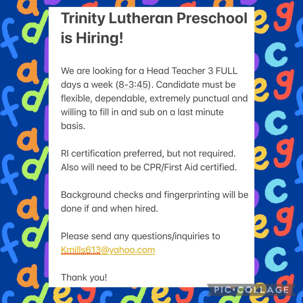 We are looking for a Head Teacher 3 FULL days a week (8-3:45). Candidate must be flexible, dependable, extremely punctual and willing to fill in and sub on a last minute basis.